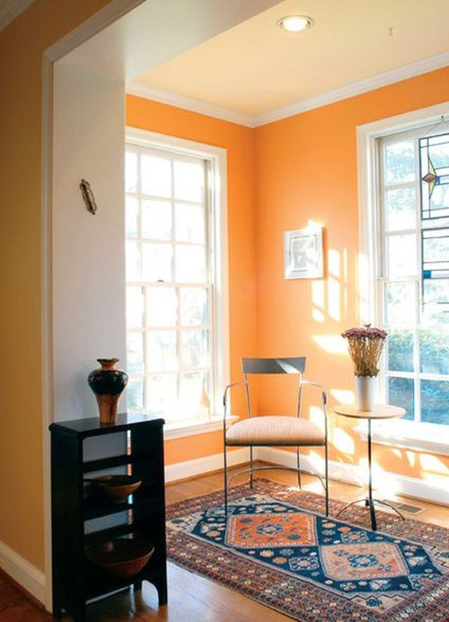 Ngôi nhà của bạn sẽ mang phong cách trẻ trung, năng động với gam màu da cam. Tuy nhiên, bạn không nên dùng màu da cam quá nhợt nhạt; vì sẽ làm cho căn phòng trở nên lu mờ và không có chiều sâu. Bạn cần phải dùng tone màu da cam sặc sỡ thì sẽ thực sự làm cho căn phòng trở nên tỏa sáng. Ngoài ra, bạn có thể kết hợp với màu xanh nước biển hoặc màu xanh ngọc lam để mang lại vẻ đẹp ấn tượng cho căn phòng của bạn.